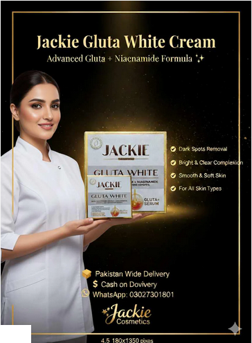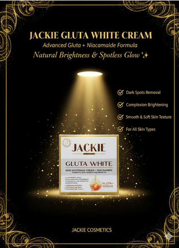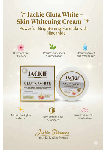 Jackie Gluta White Beauty Cream is expertly formulated to give your skin a luminous, radiant glow. Enriched with Glutathione, Niacinamide (Vitamin B3), and Vitamin E, this advanced formula brightens, hydrates, and revitalizes your skin — leaving it silky smooth and refreshed. It helps diminish dark spots, acne marks, and pigmentation, revealing a clear, even-toned, and flawless complexion. ✨ Key Benefits: Brightens dull and tired skin tone Reduces dark spots and pigmentation Deeply hydrates and softens skin Improves skin texture and smoothness Adds instant glow and radiance Revitalizes and refreshes the skin 🧴 Main Ingredients: Aqua, Alpha Arbutin, Kojic Acid Dipalmitate, Vitamin B3 (Niacinamide), Glycolic Acid, L-Glutathione, Glycerin, Stearic Acid, Tocopheryl Acetate (Vitamin E), Glyceryl Stearate, Cetyl Alcohol, Dimethicone, Phenoxyethanol, Fragrance.